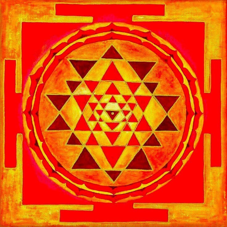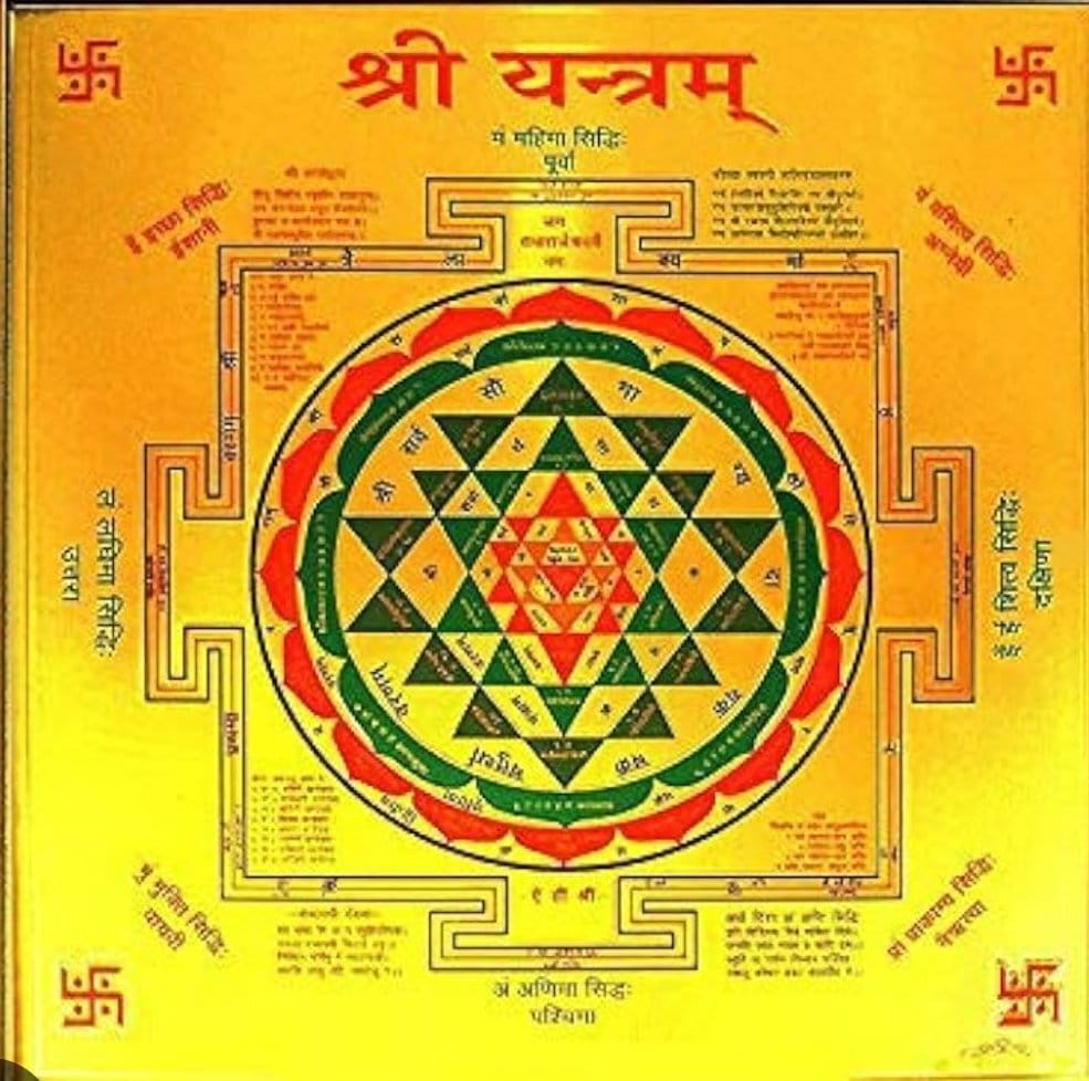 The Sri Yantra is known to be a chariot which delivers insight into the essence of being. It is the abstract form of the universe the material nature or divine mother. She is the power which creates sustains and dissolves everything that there is to experience, she rests in what is known as pure consciousness identical with Brahman, Tao, God or any of his names by which he is known.