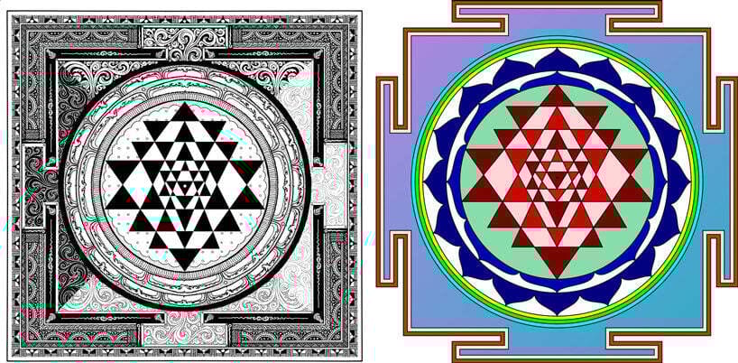Inside of these two lotuses are five circles consisting of triangles, the triangles represent principles of the subtle body.